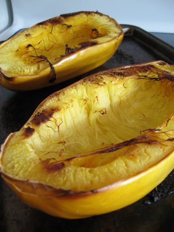 1. Bake spaghetti squash in oven as per the sticker directions.